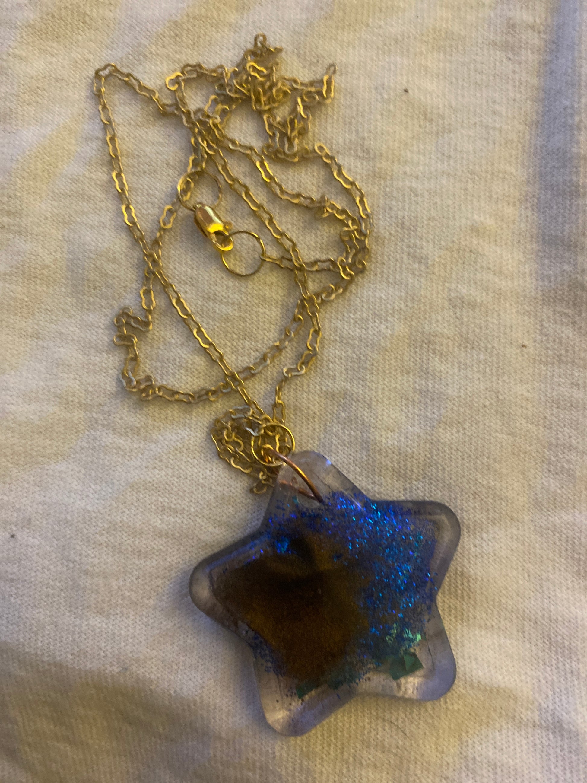 22k gold plated findings & 22k gold plated crinkle chain with a handmade, resin star pendant blue & brown, and a copper circle jump ring.