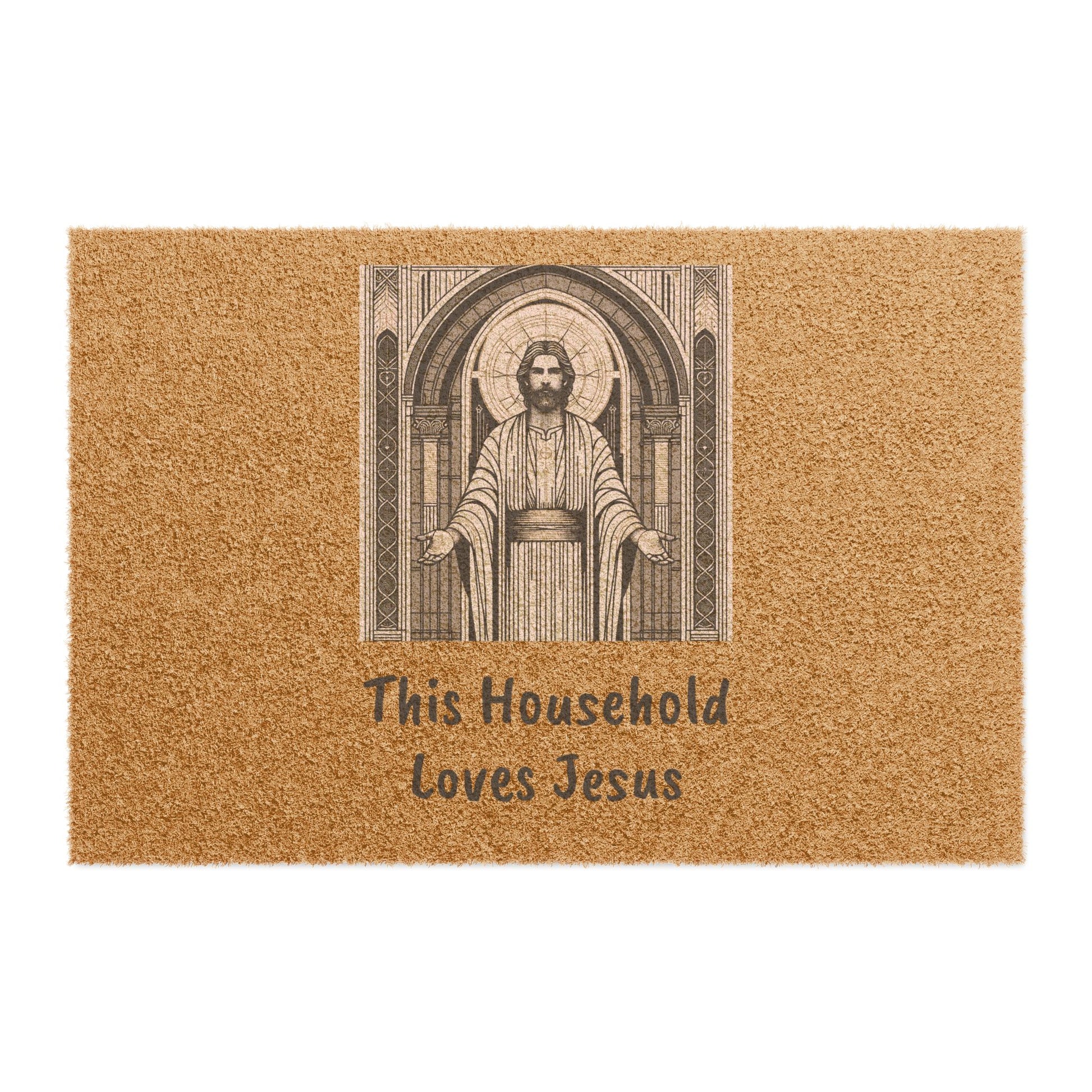 A doormat featuring a picture of Jesus in front of a church with the words 'this household loves Jesus'. It adds a welcoming and religious touch to any entryway, making it perfect for Christian families and individuals. Ideal for Easter, Christmas, and everyday use.