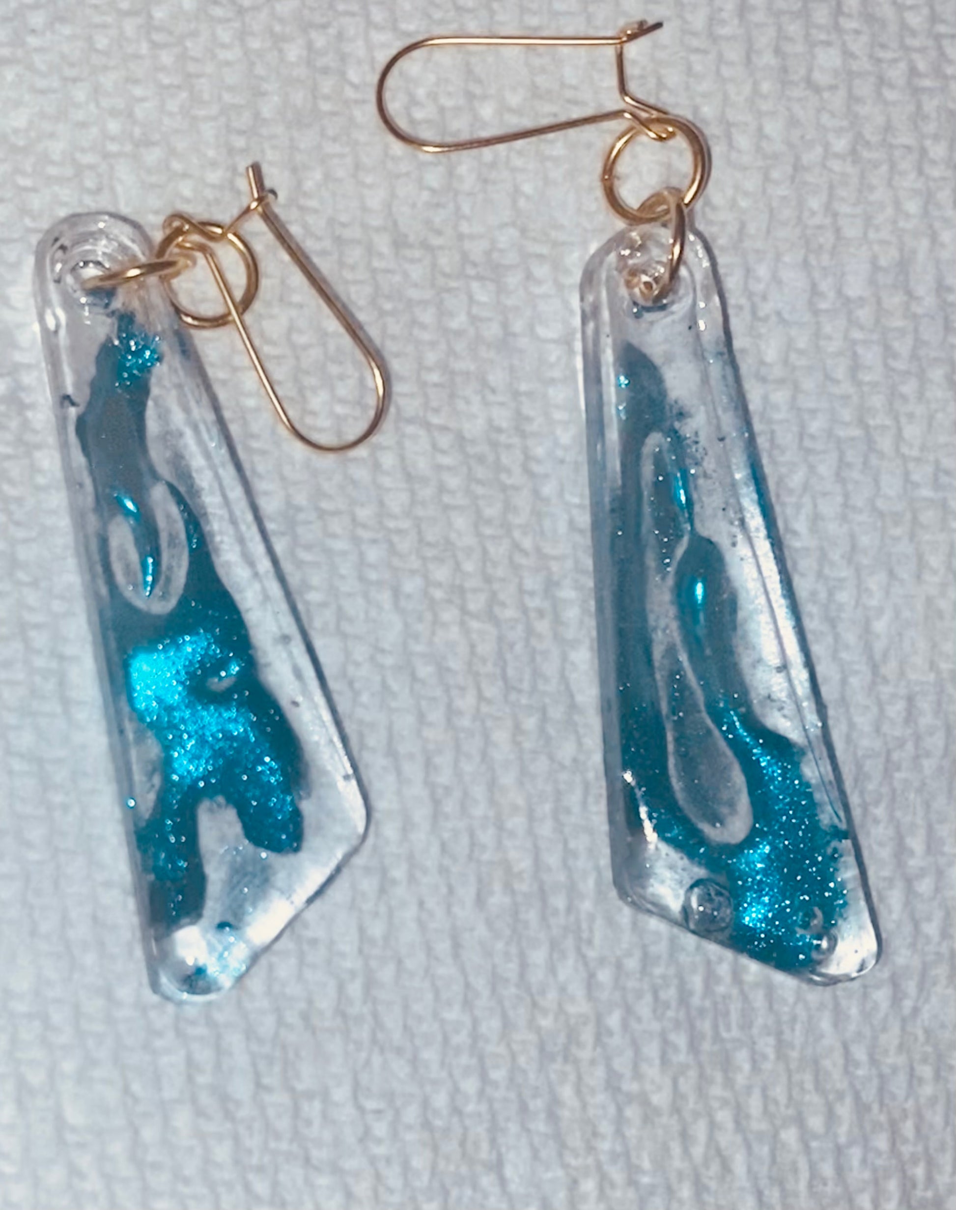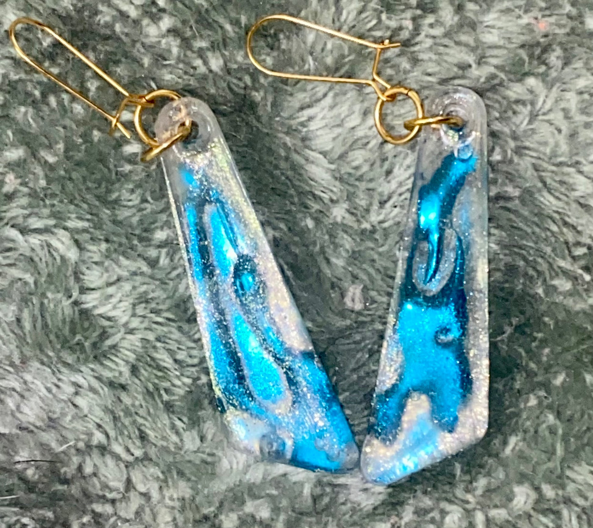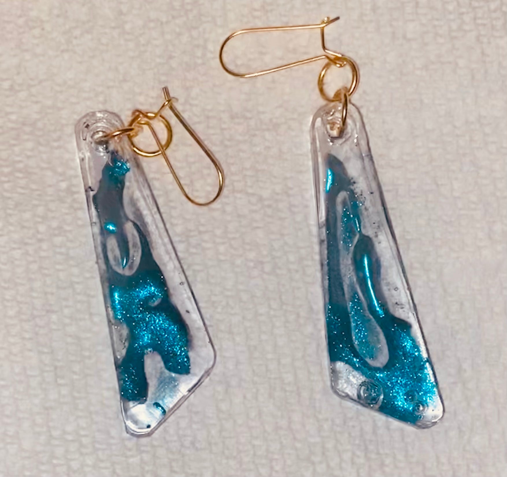 These resin earrings are expertly crafted with 14k Gold Plated wire and a beautiful blue color. They are handmade and priced competitively in the market.