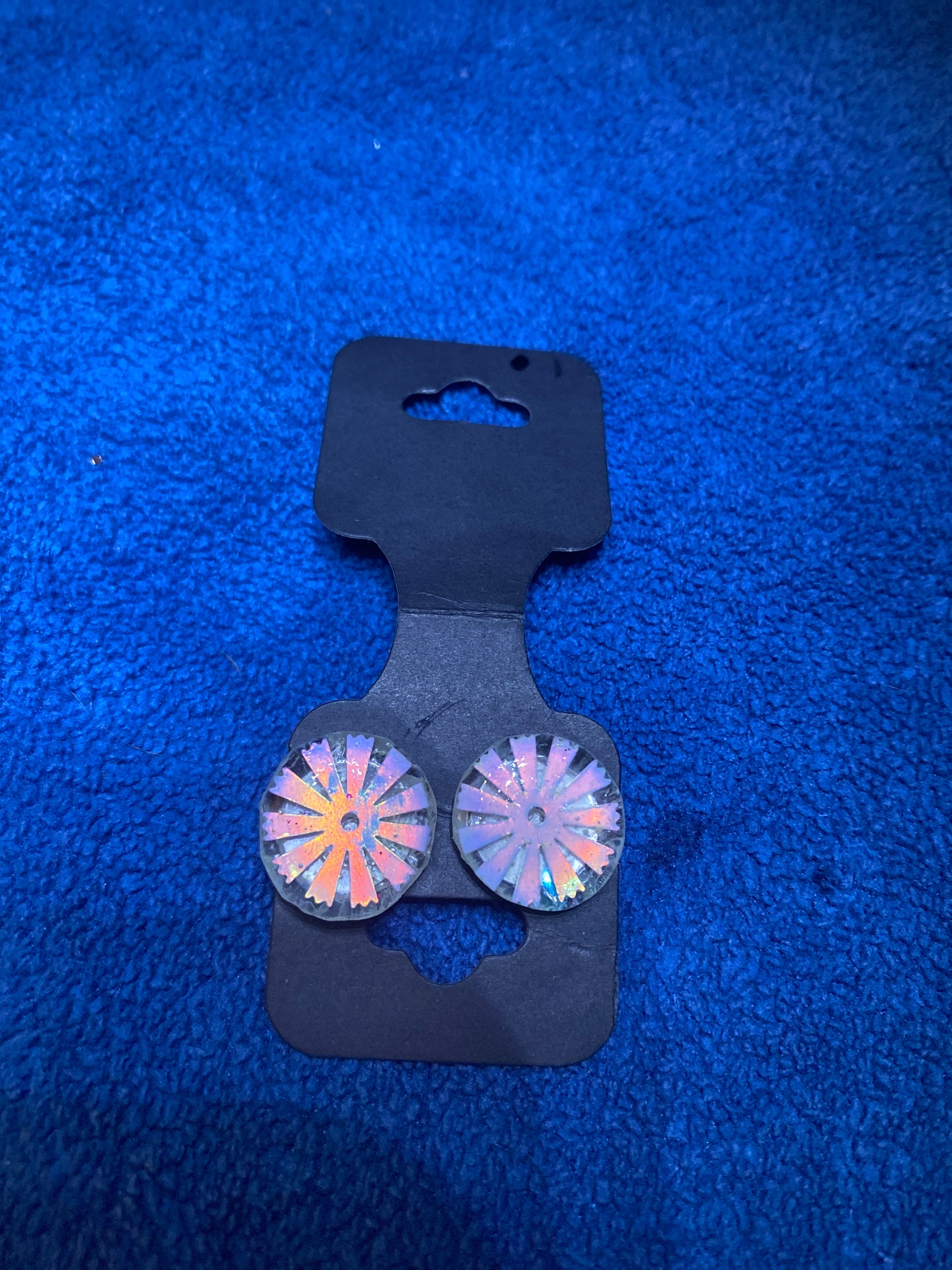These post earrings are 3/4 inch stainless steel, with a star/flowerlike decor inside made from Resin. They're lightweight and play with light, shimmering in different shades of color.