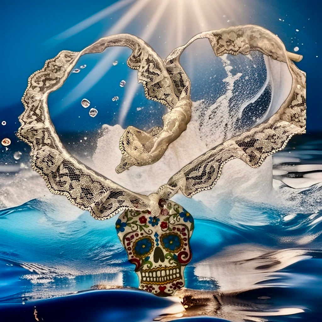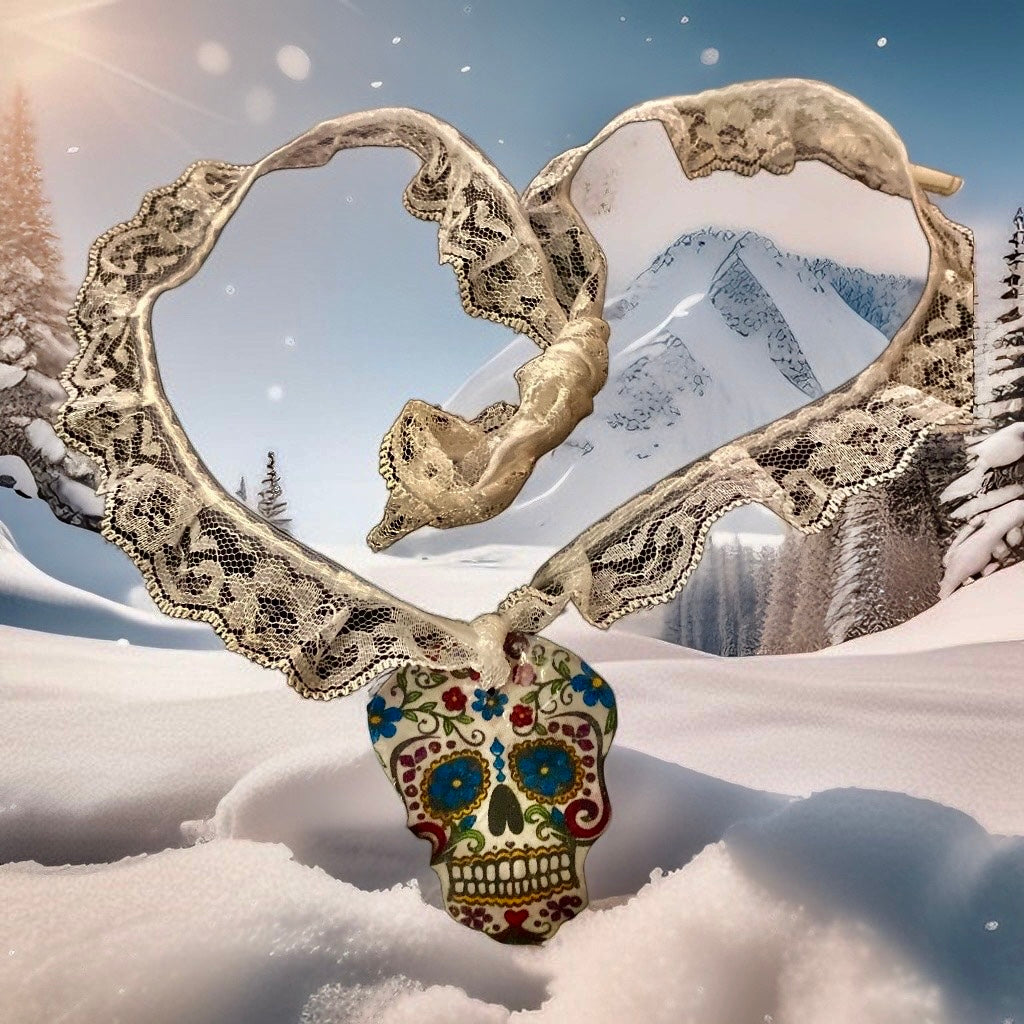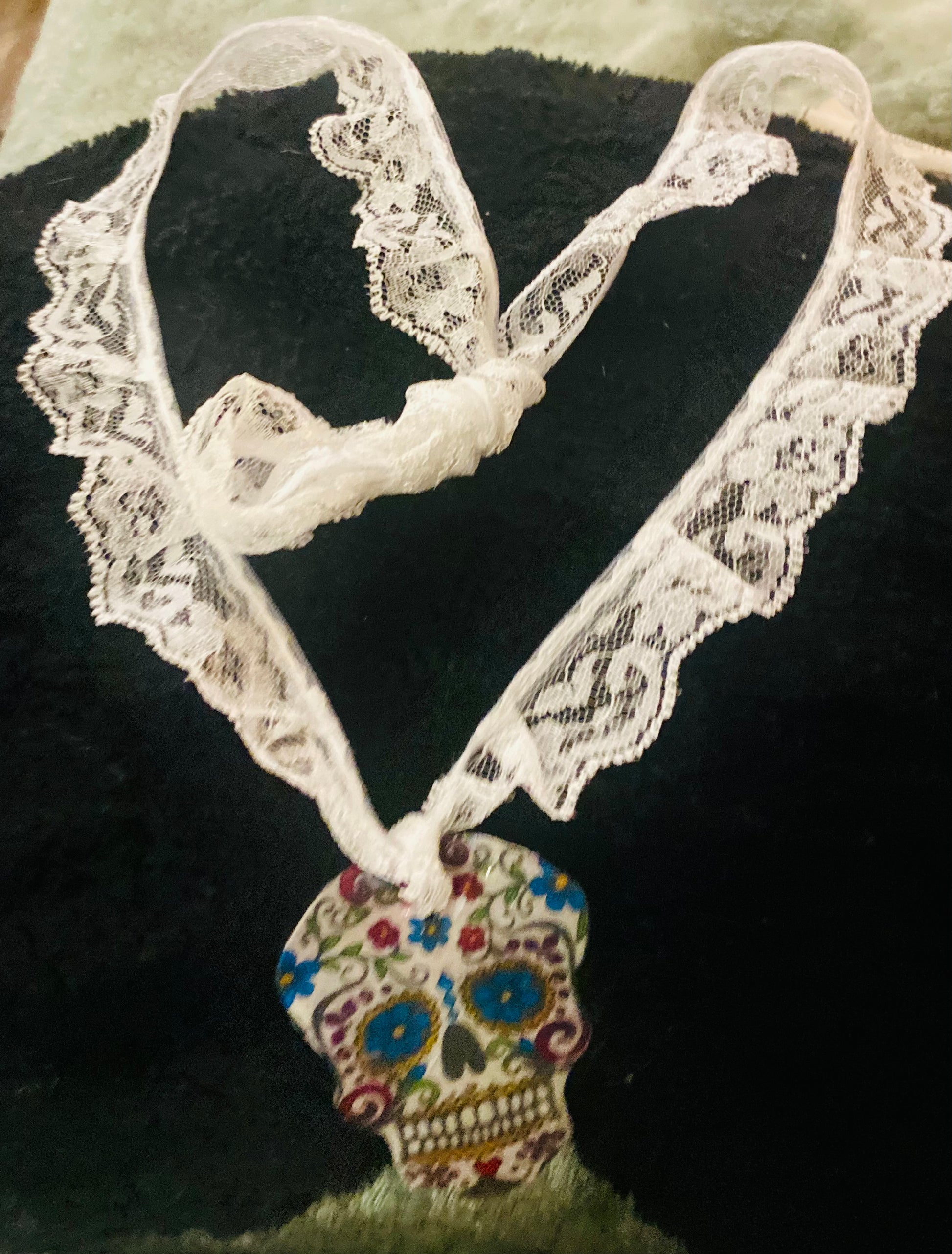 3inch X 2 1/2inch Skull made from resin over cloth. Simply hung from a long piece of ribbon.