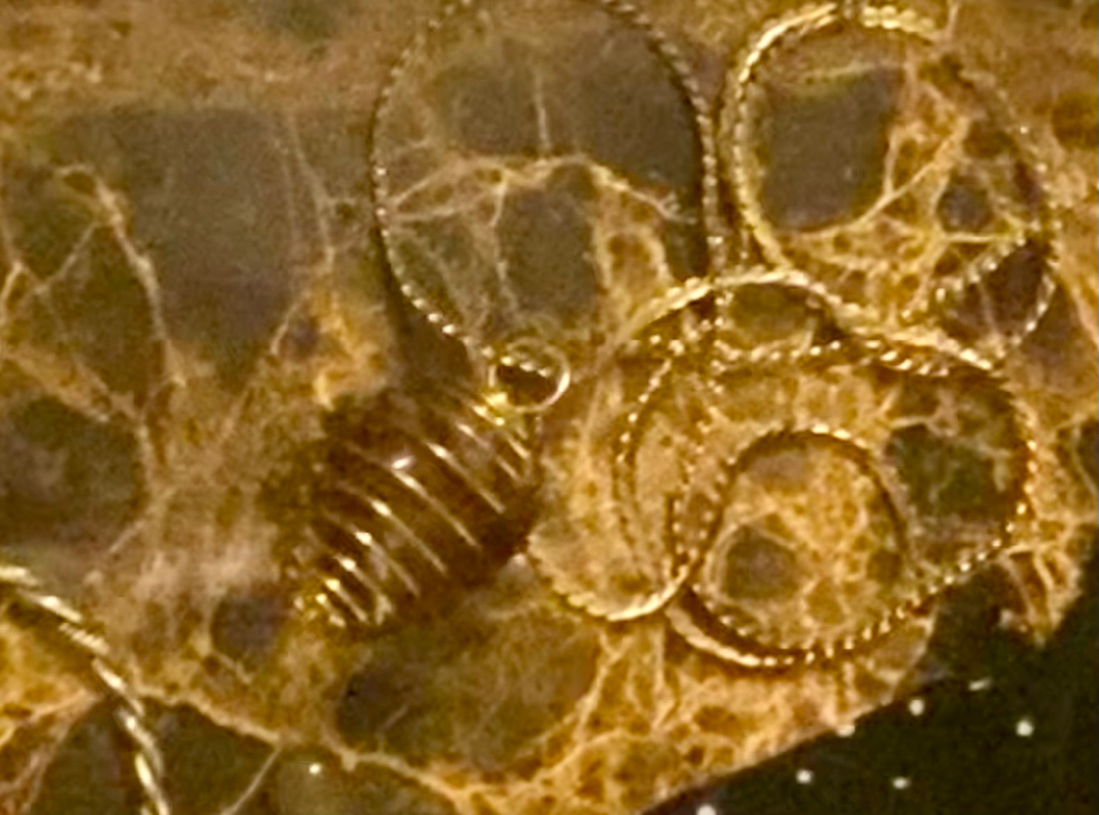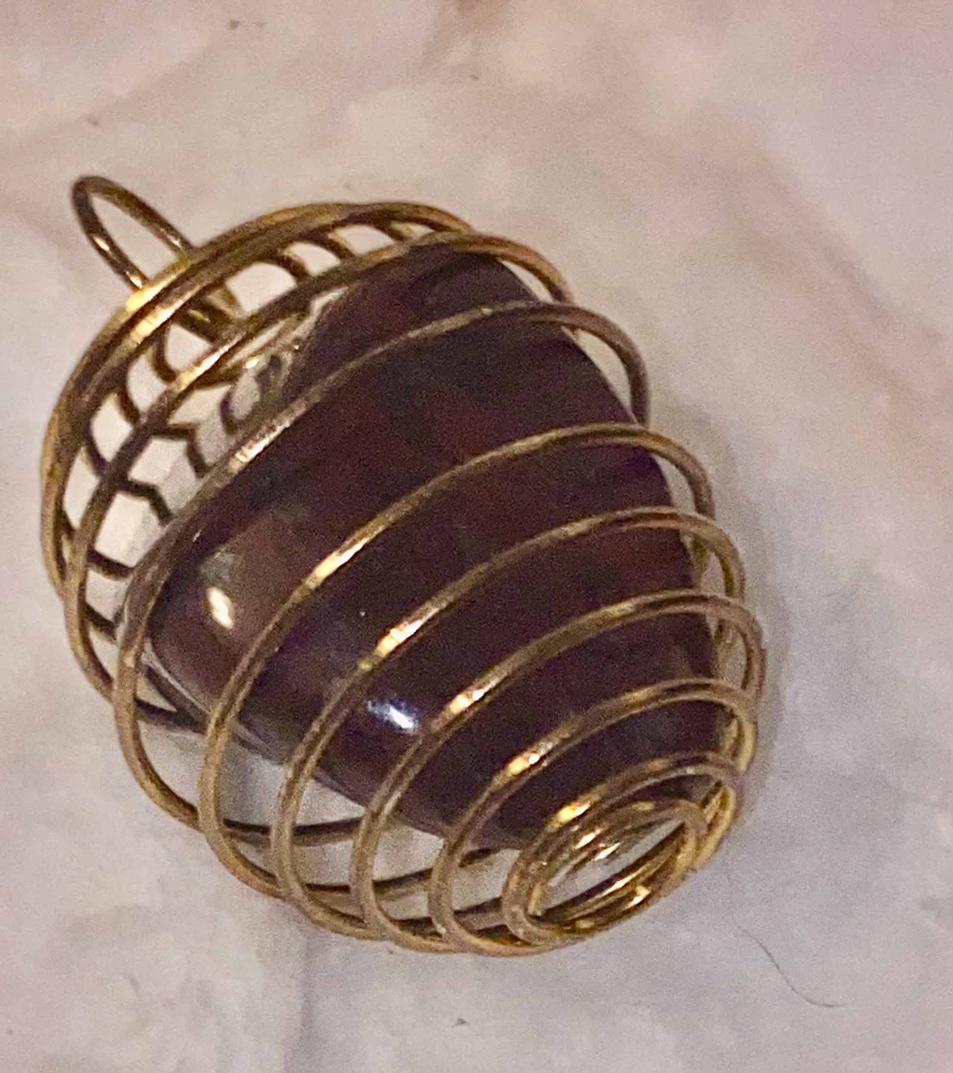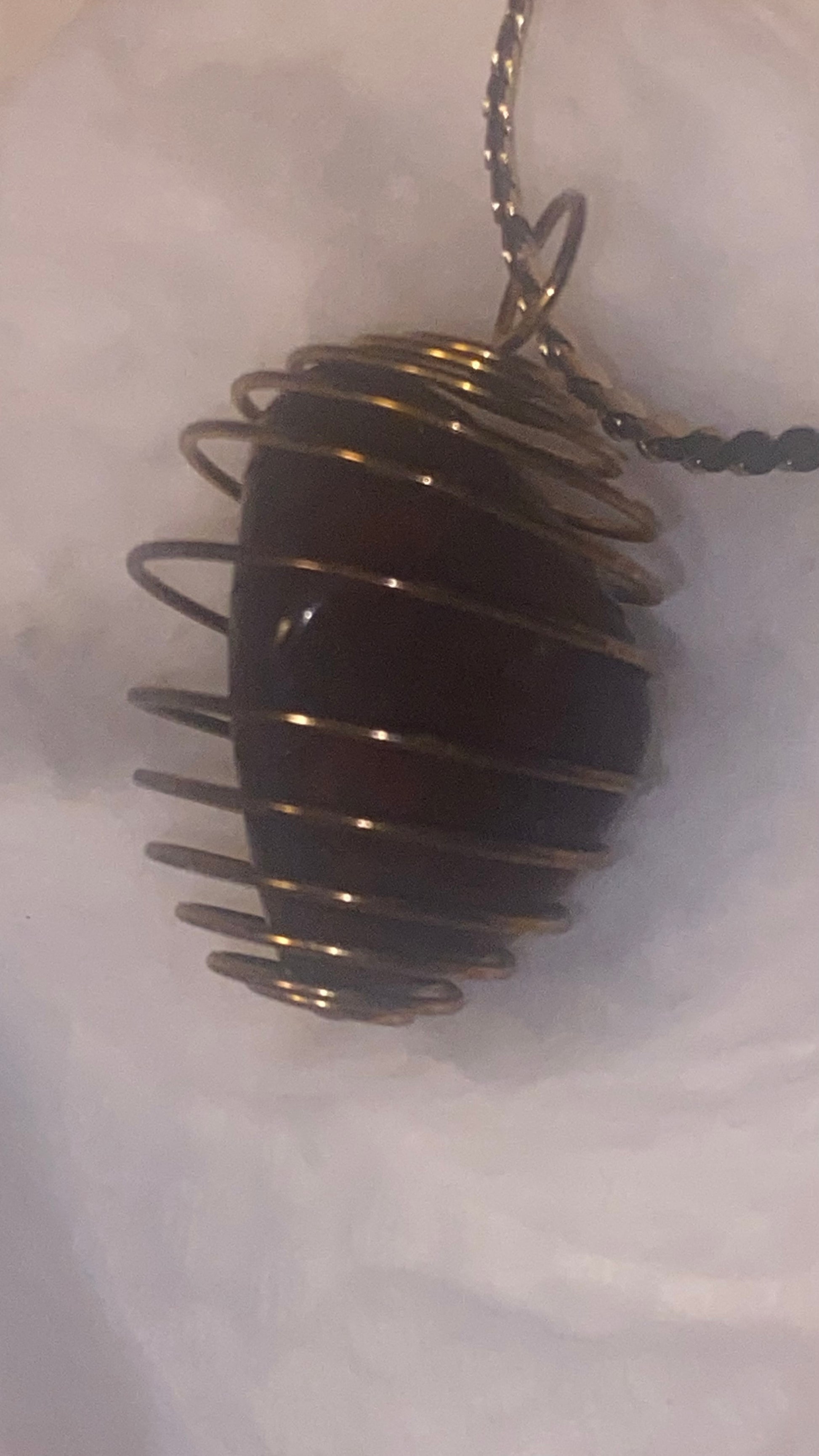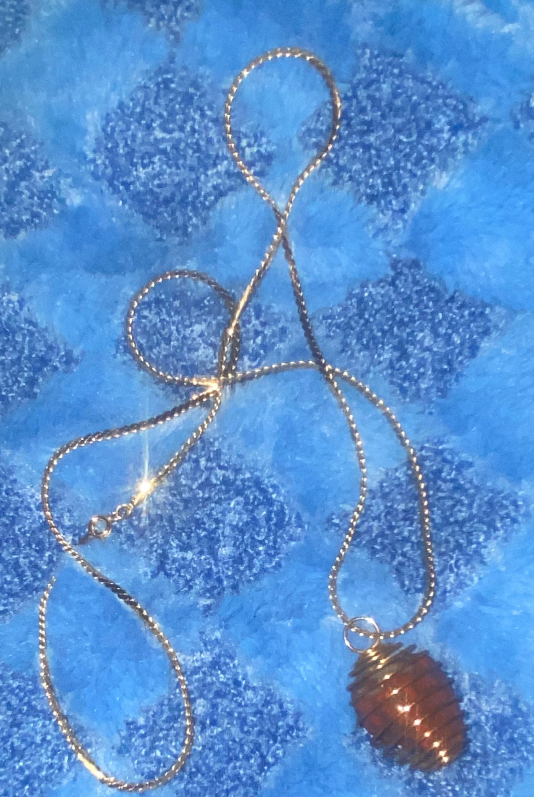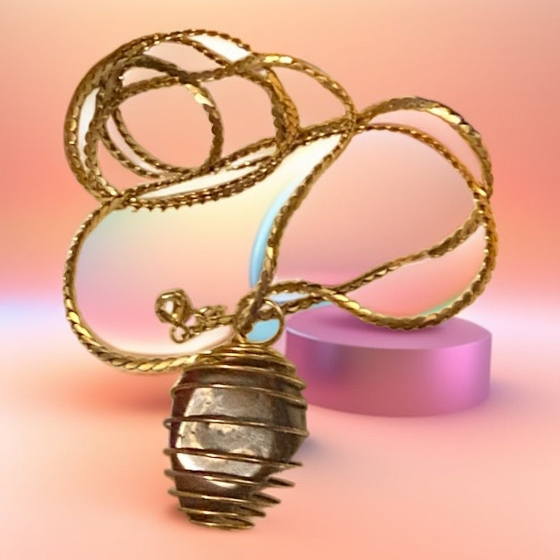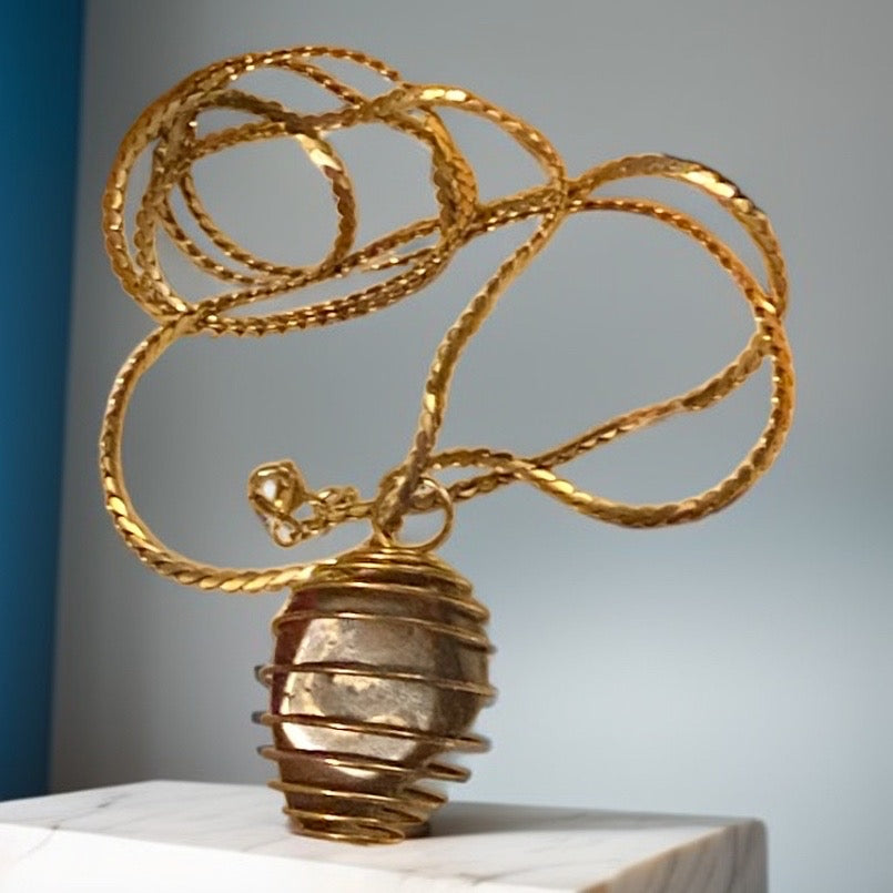 A lustrous Red Jasper and Hematite gemstone is delicately cradled in a gold-toned wire basket. The 29-inch, untested, slightly magnetic chain adds a touch of sophistication, completing the luxurious and exclusive design.