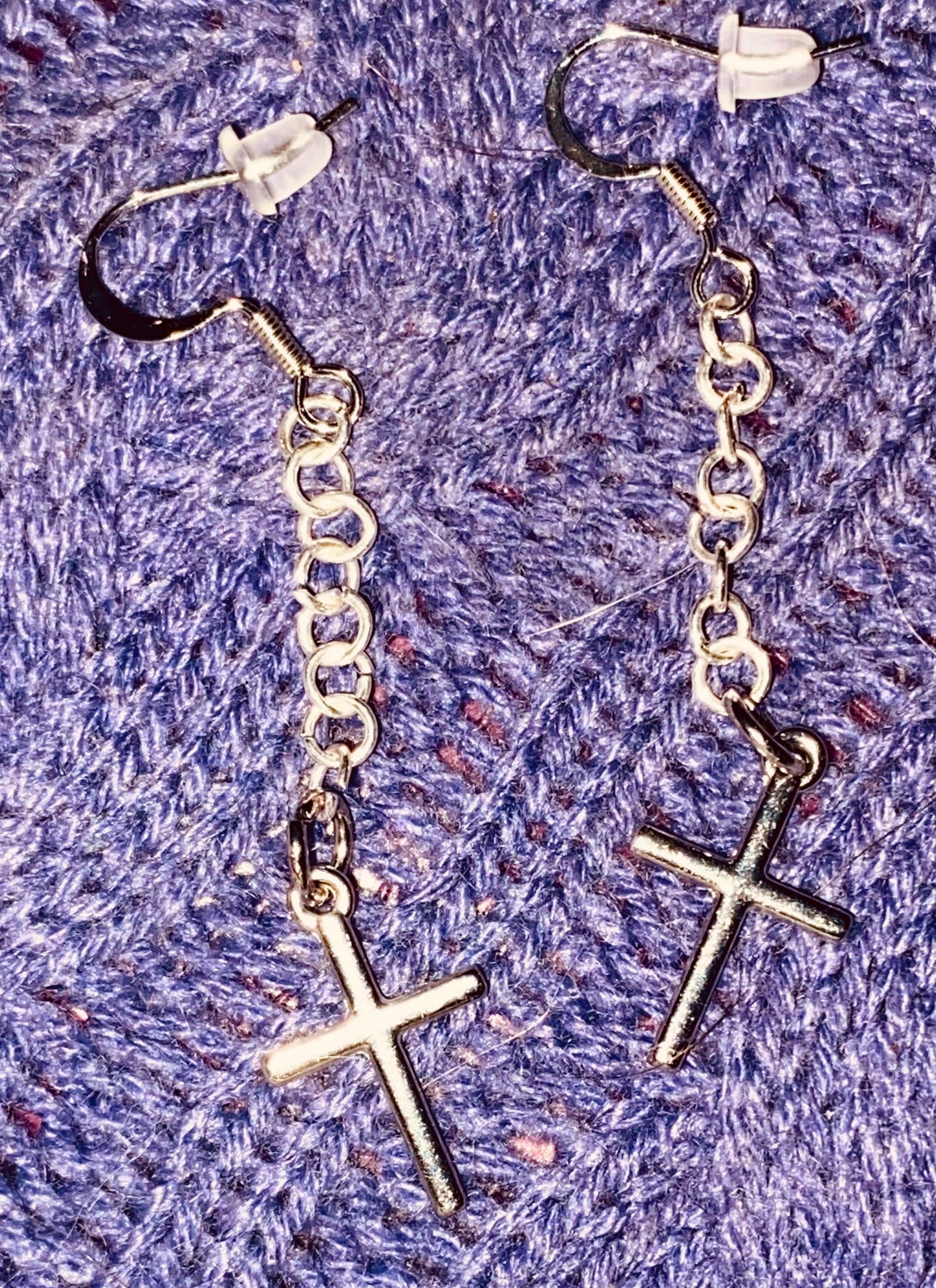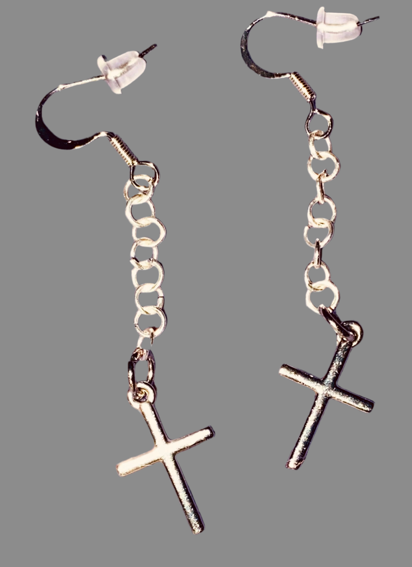 Simple Silver-toned Cross earrings hanging from linked chain.