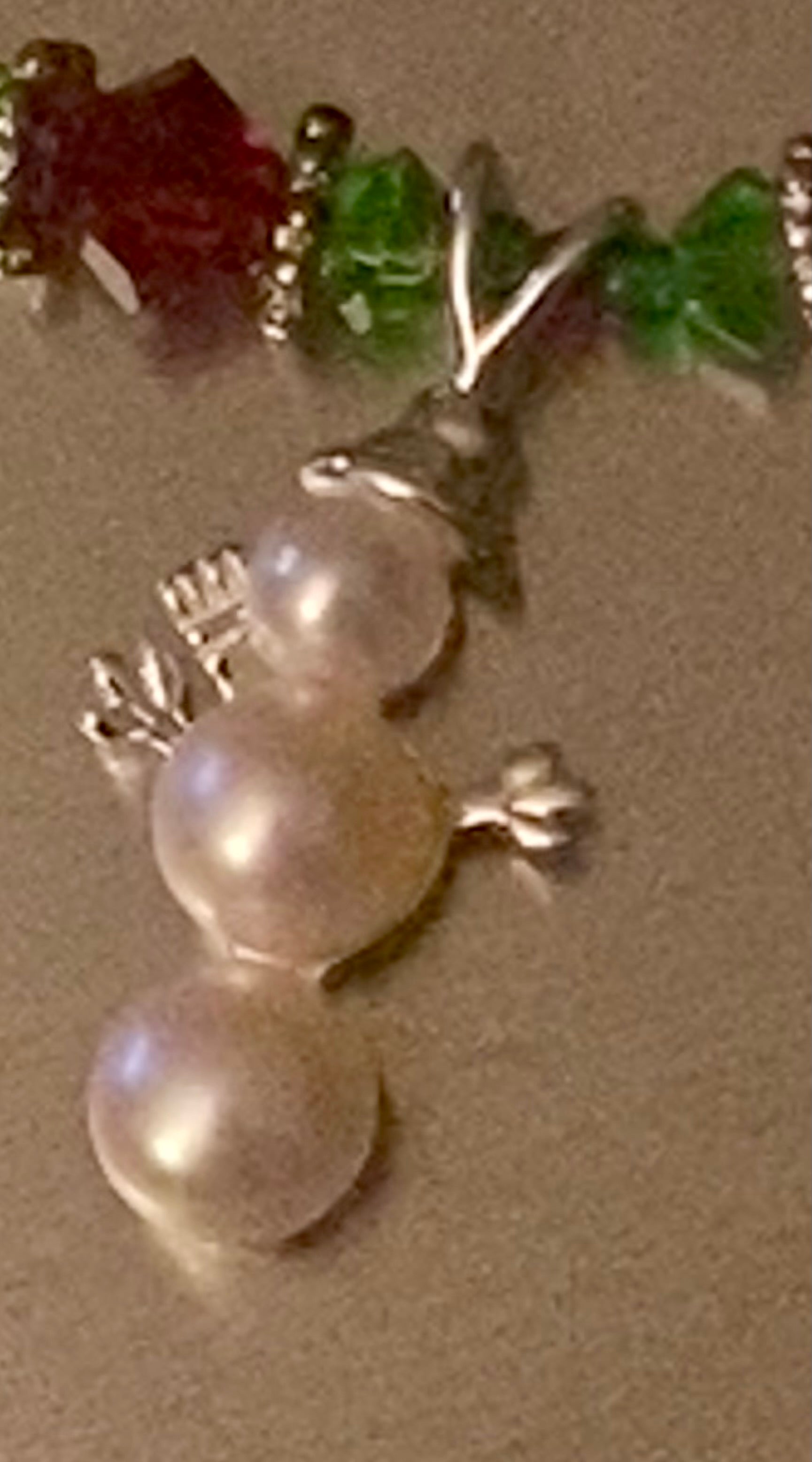 Snowman made of (3) Cultured Pearls, Sterling Silver (925), and Crystal Christmas Beads.