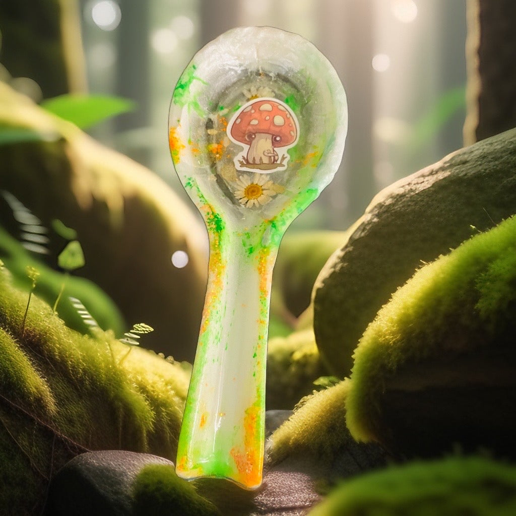 Get ready for some serious groovin' in the kitchen with this Stove Utensil Tray featuring Resin, Mushroom, and Dried Flowers. The bright, blacklight-reactive colors add a retro touch and the overall vibe is pure peace, love, and fun. Get your inner hippy on and add this playful tray to your cooking routine!