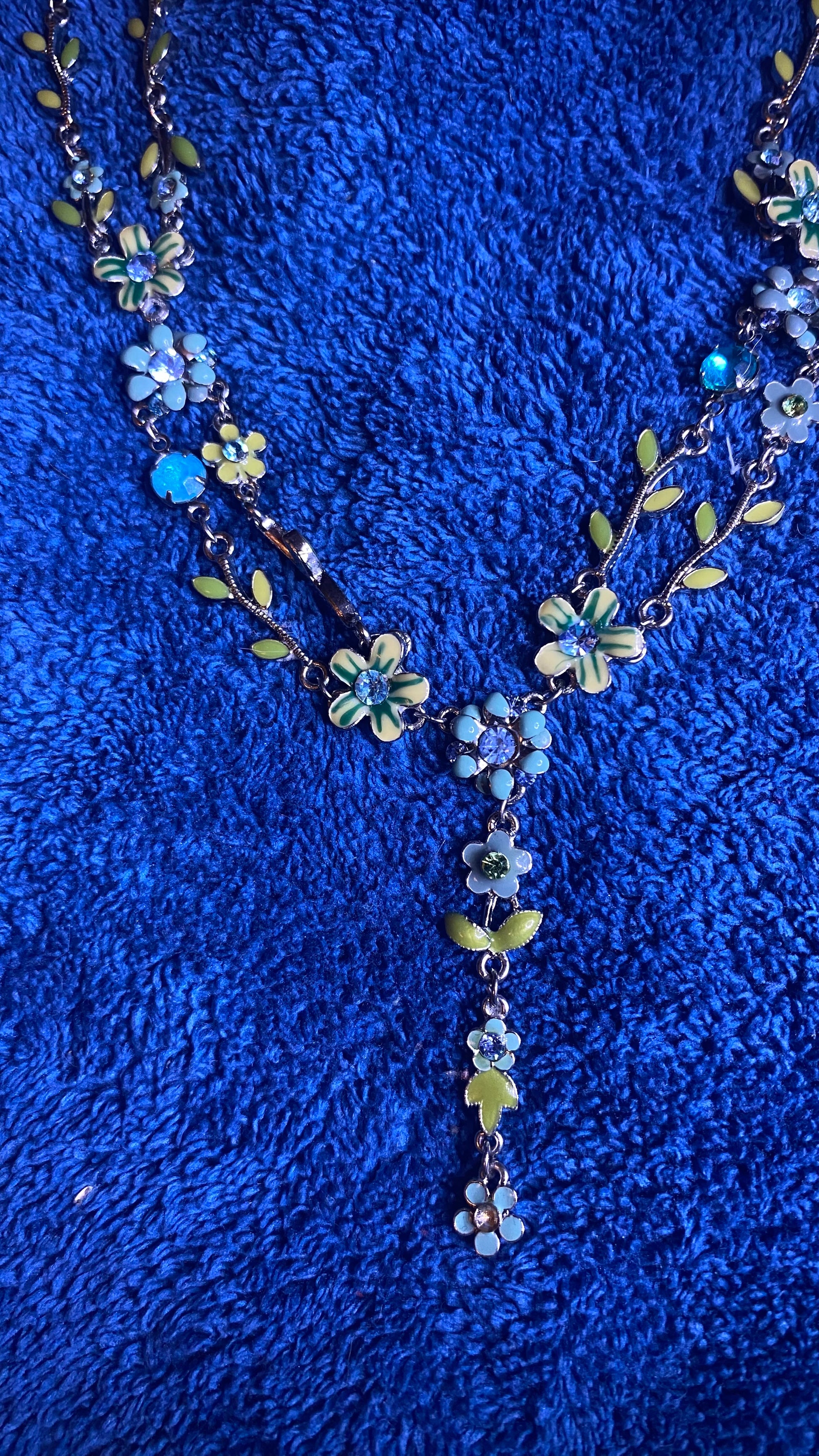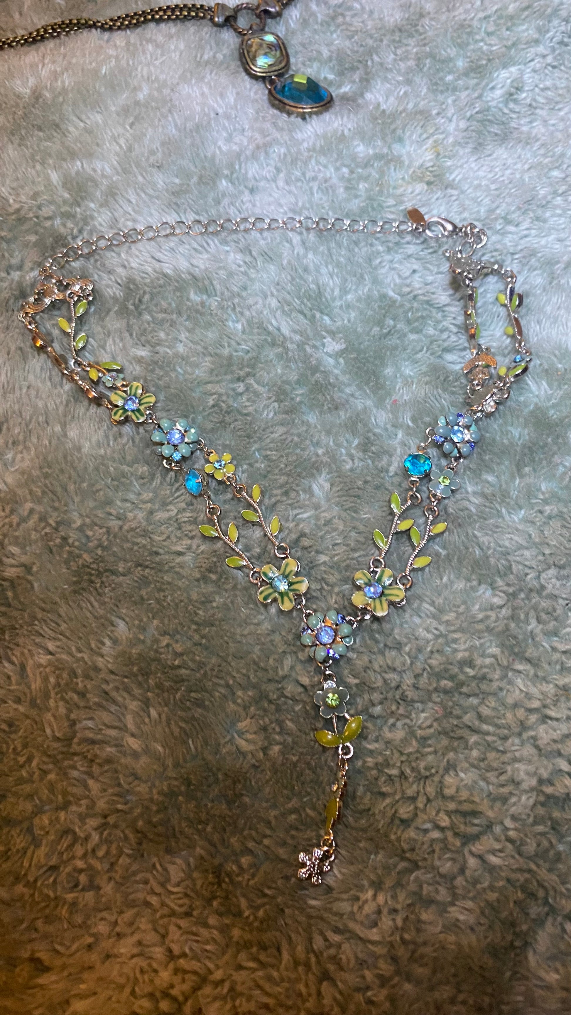 Vintage necklace, chain tag says VCLM. Very petite & pretty blue rhinestone and enamel flowers.