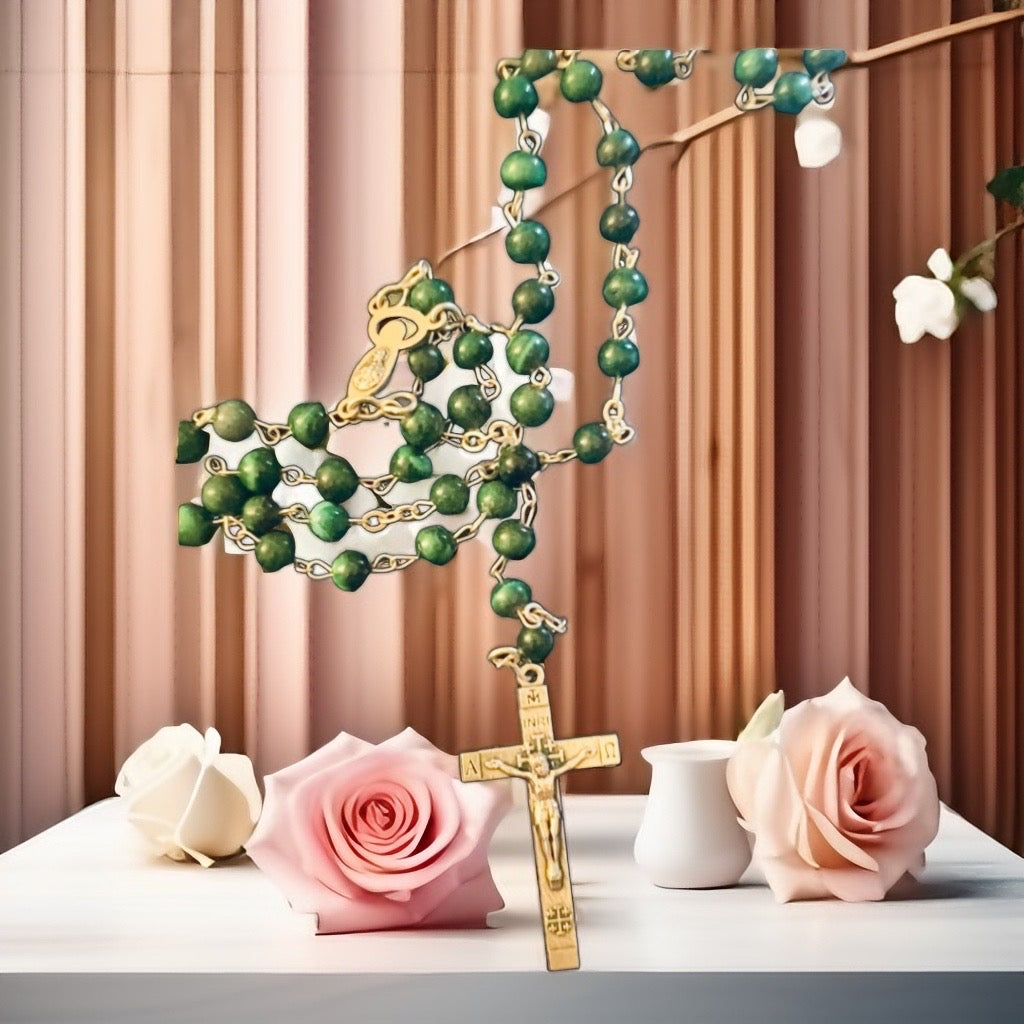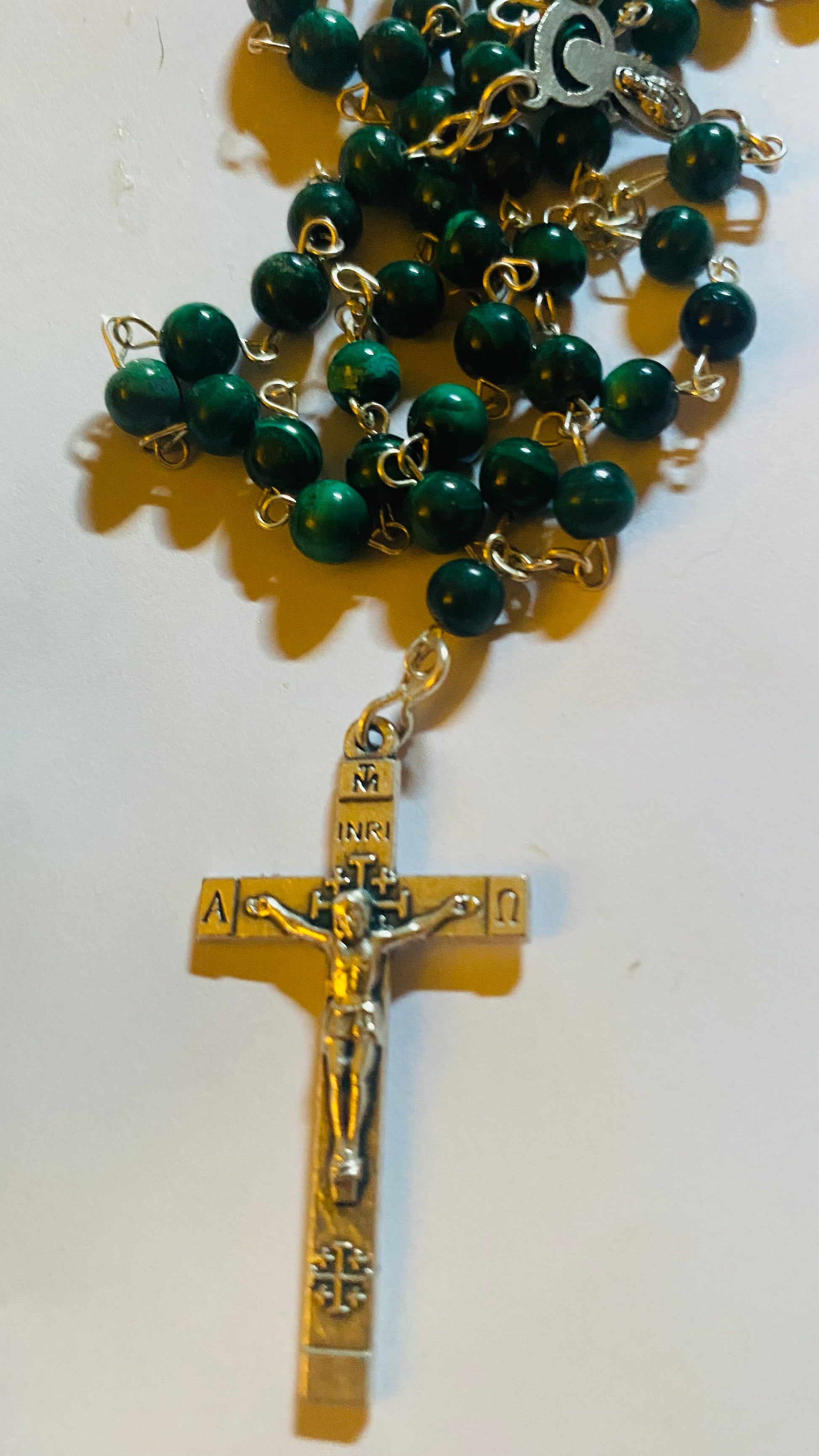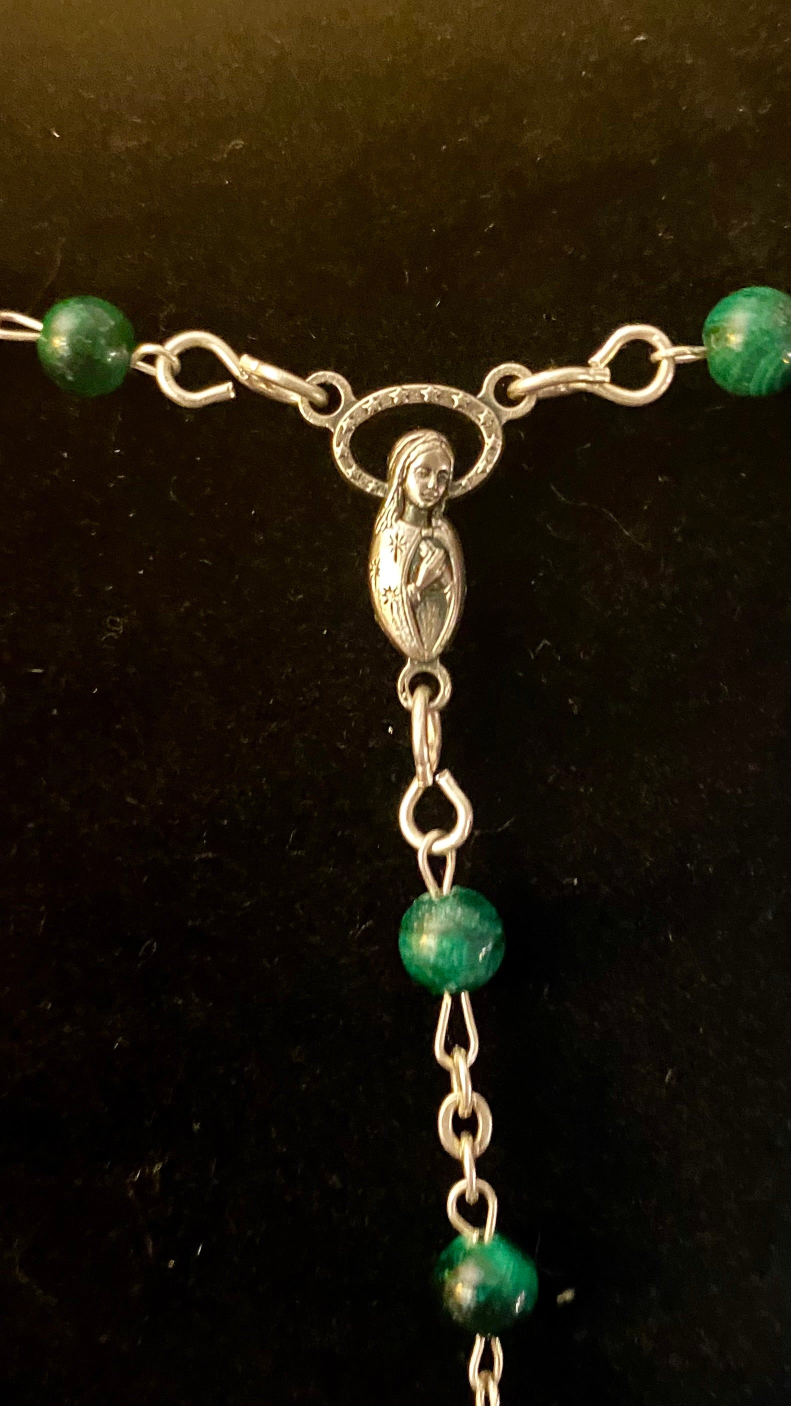 A Jerusalem, vintage rosary in immaculate condition (no pun intended)! Malachite and Silver Plate. Very Nice!