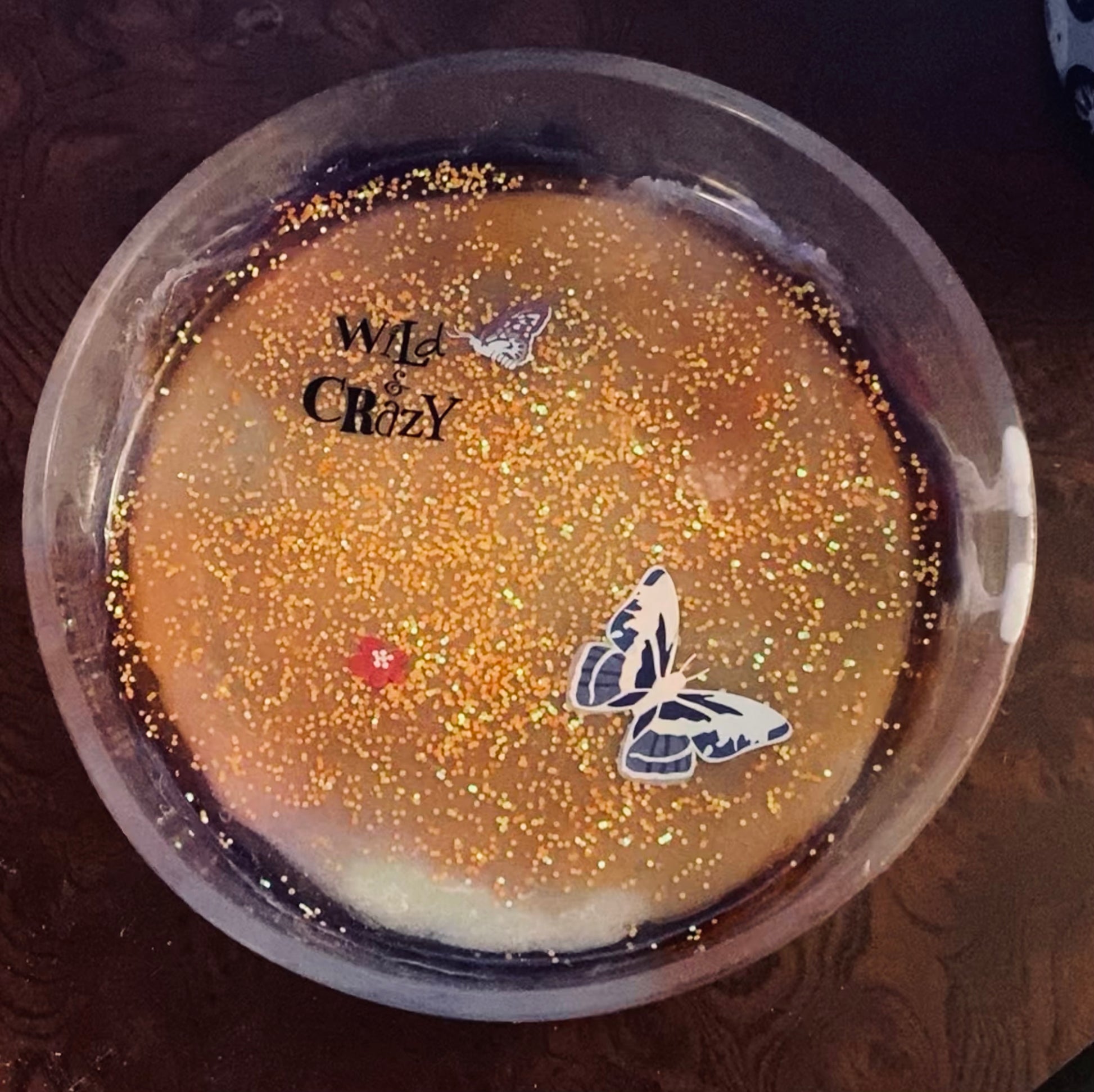WILD & CRAZY LARGE DISH orange glittery, w/butterflies.